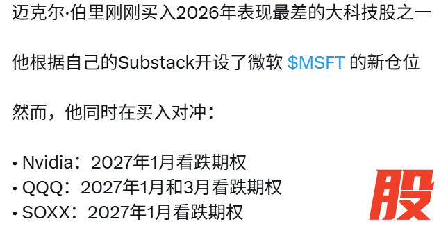 迈克尔·伯里因电影《大空头》中的原型角色而闻名。这位投资人近日在自己的Substack平台发文称,他已经通过买入iShares半导体ETF(SOXX)的看跌期权,建立了新的空头仓位。这批期权到期日为2027年1月,行权价为330美元。