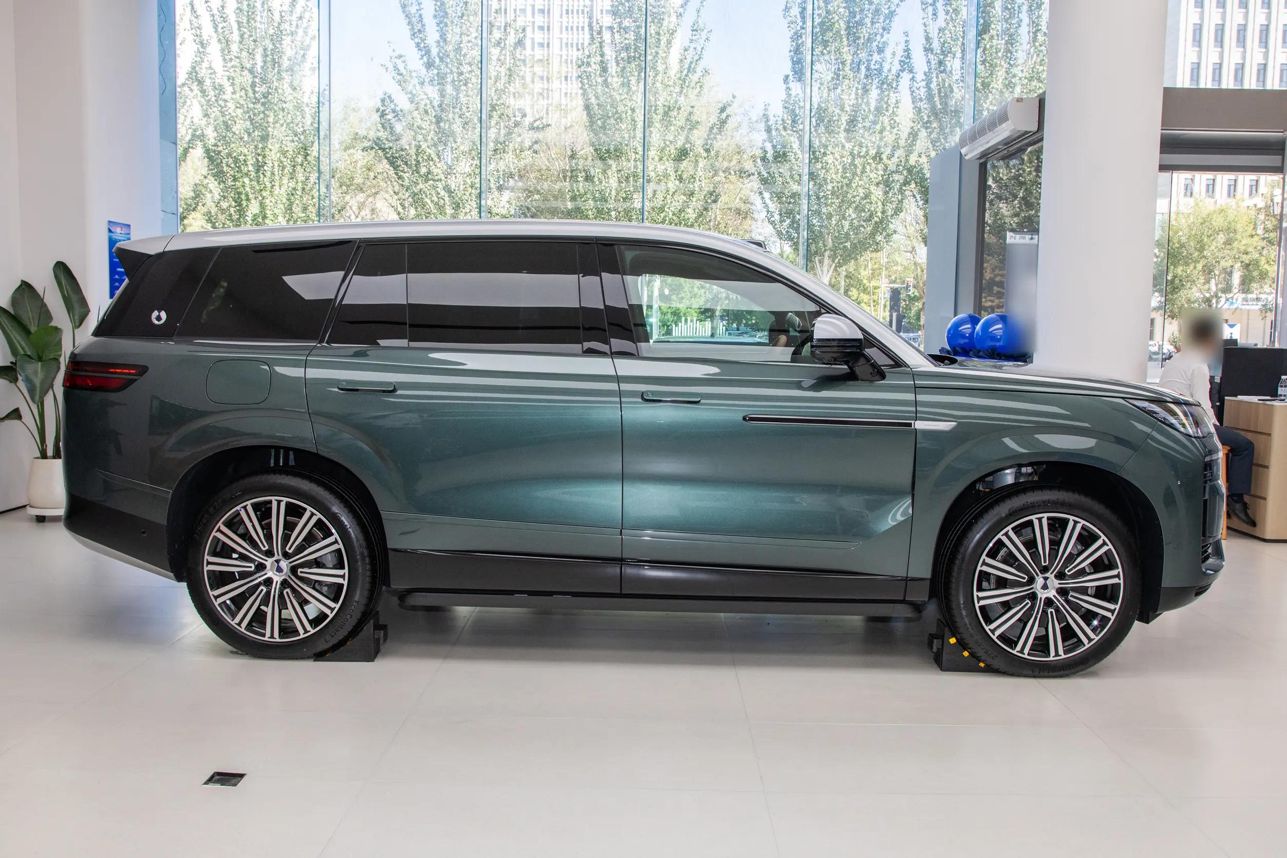 侧面造型展现了纵向建筑感的轮廓,采用纯平车门和隐藏式水切设计,让车身侧面看起来简洁利落。"风绘流光"腰线微微上扬,为整车增添了几分动感。22寸多辐星曜轮毂进一步强化了车辆的力量感。新车提供紫瑢金、红雅金、蓝辰银、绿华银四款双色车身和霜云茶单色车身,采用BASF高外观清漆工艺,提升了漆面的质感和耐久性。