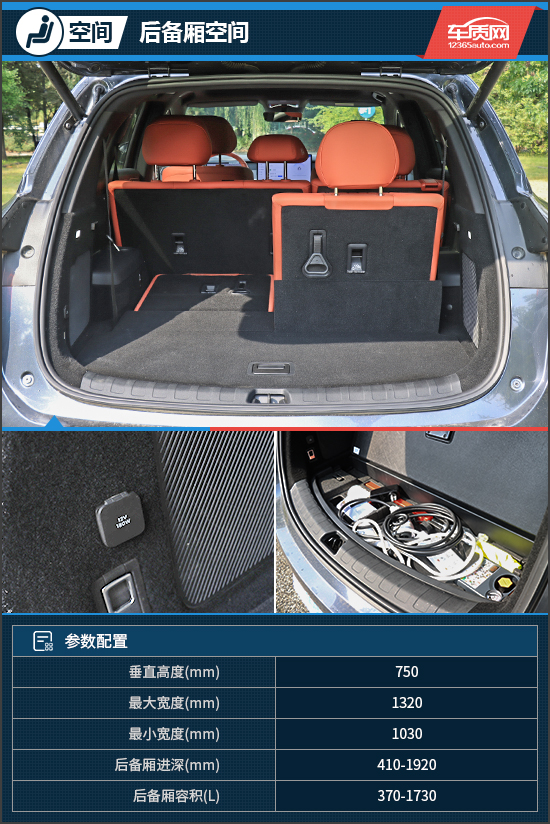 后备厢内部规整,地台盖板下方提供了一个容积较大的储物槽,可以放置充电设备。后备厢左侧还配备了12V电源接口,方便为车载设备供电。此外,将第三排座椅放倒后可以形成一个平整空间,容积达到了1960L。