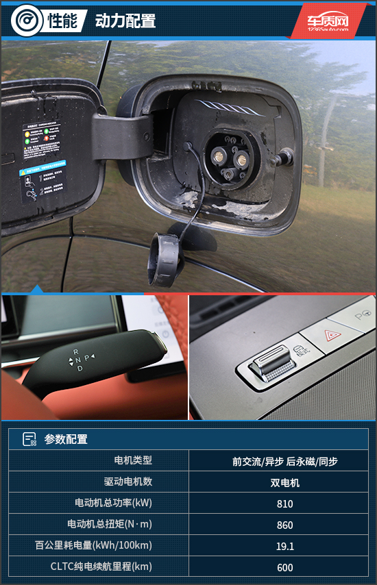 评测车搭载前后双电机,总功率810kW,总扭矩860N·m,CLTC纯电续航里程为600km。超级e平台支持全域千伏高压架构,可实现兆瓦闪充,最高8.4C充电倍率,闪充5分钟弘大速配,可增加370km的续航里程,并且还提供“双枪充电”,相当于给快充加上“物理外挂”。
