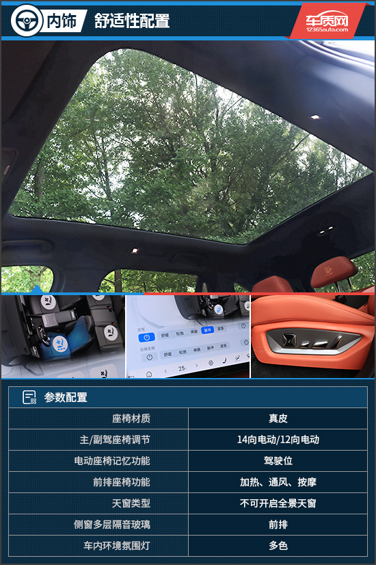 舒适性配置方面,评测车配备不可开启全景天窗,尺寸可观,并带有电动遮阳帘,不仅能够减少车内的压抑感,还可以物理防晒。同时,前排和第二排的真皮座椅均支持通风、加热和按摩功能,并同时提供双开门车载冷暖冰箱等进阶配置,共同营造出多感融合的豪华体验。